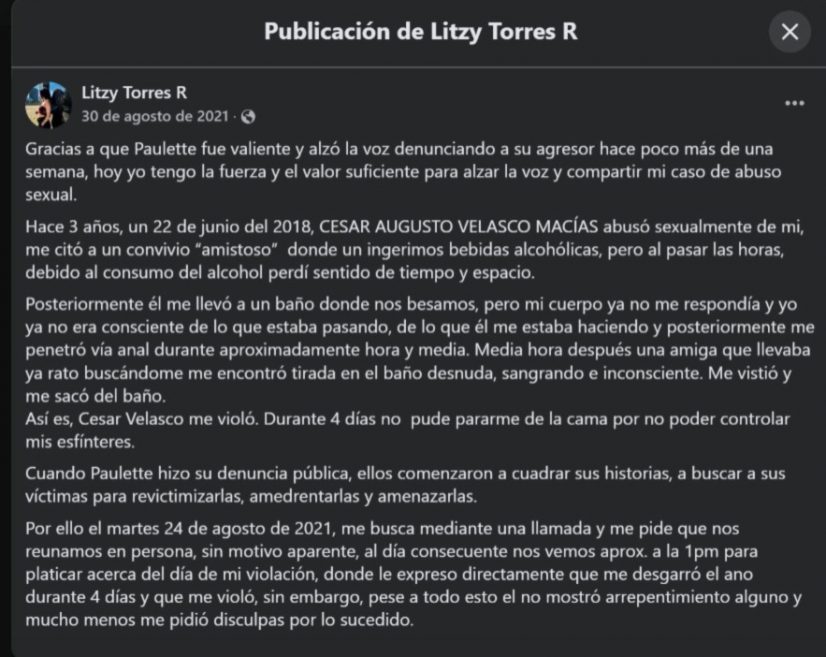 “Hace 3 años, un 22 de junio del 2018, CESAR (sic) AUGUSTO VELASCO MACÍAS abusó sexualmente de mi (sic), me citó a un convivio ‘amistoso’ donde ingerimos bebidas alcohólicas, pero al pasar las horas, debido al consumo del alcohol perdí el sentido del tiempo y el espacio”, refiere la publicación de Litzy.