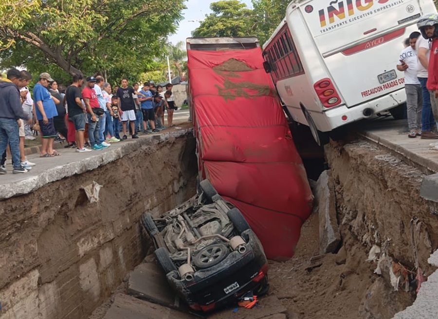 Socavón en Avenida Malecón, Colonia El Bethel de Guadalajara, dejó 3 personas lesionadas y vehículos afectados.