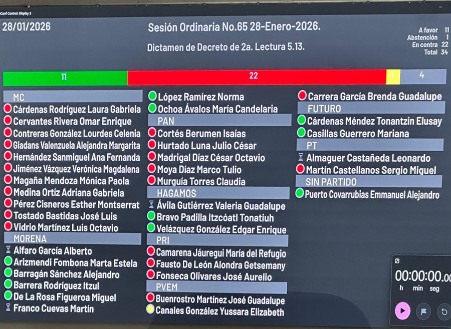 Yussara Canales, diputada del Partido Verde, votó en abstención; y no se presentaron los legisladores de Morena, Alberto Alfaro y Martín Franco; Valeria Ávila, de Hagamos; y Leonardo Almaguer, del PT.