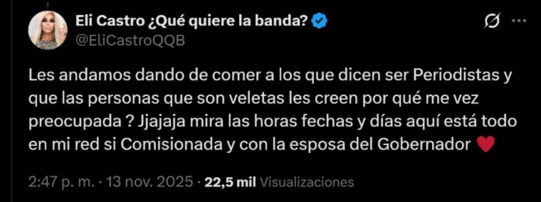 “Les andamos dando de comer a los que dicen ser Periodistas y que las personas que son veletas les creen por qué me vez preocupada?”, indica el mensaje divulgado por Eli Castro.